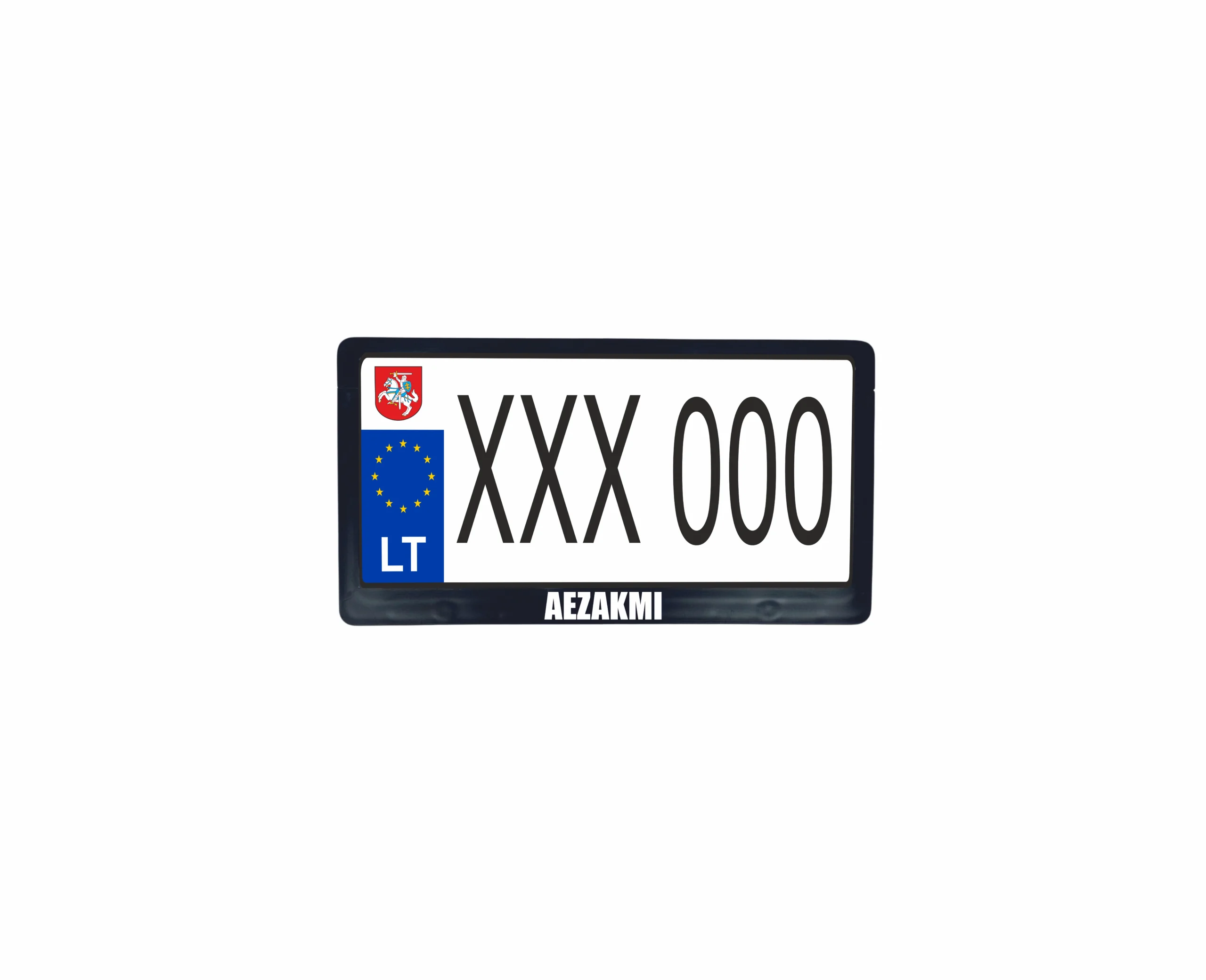 JAV tipo rėmelis numeriui su užrašu – aezakmi. Pagaminta Lietuvoje